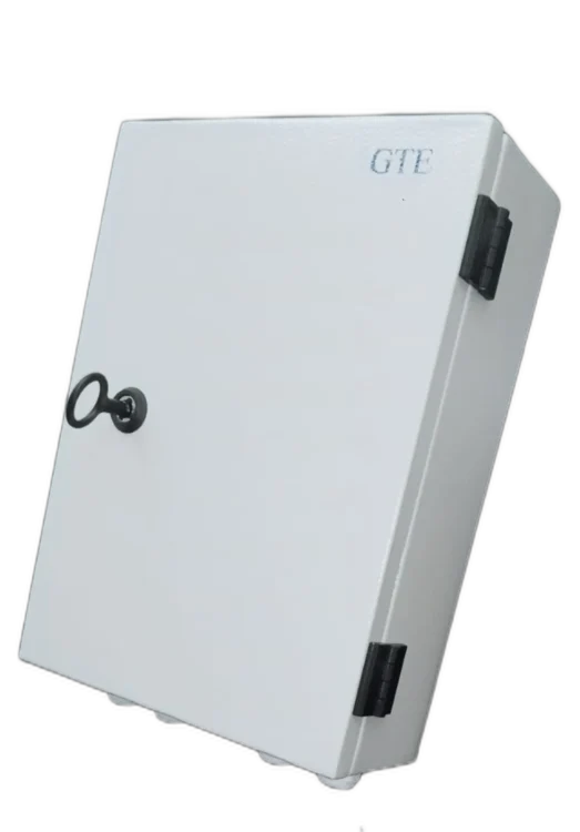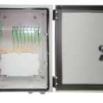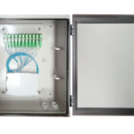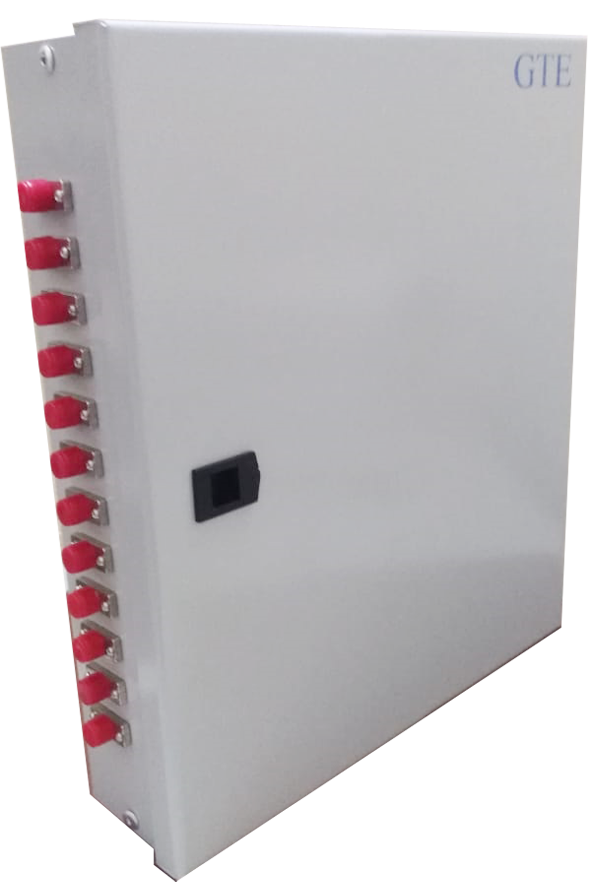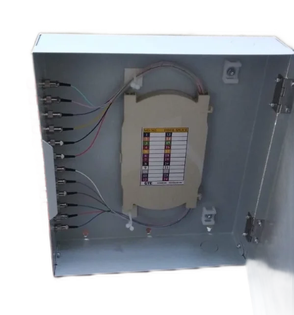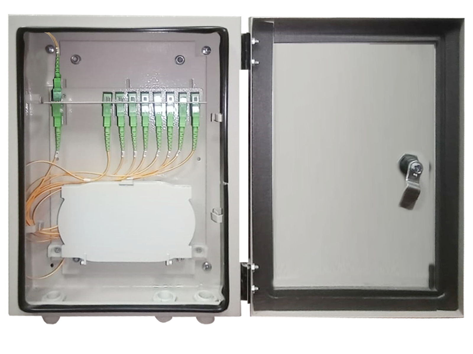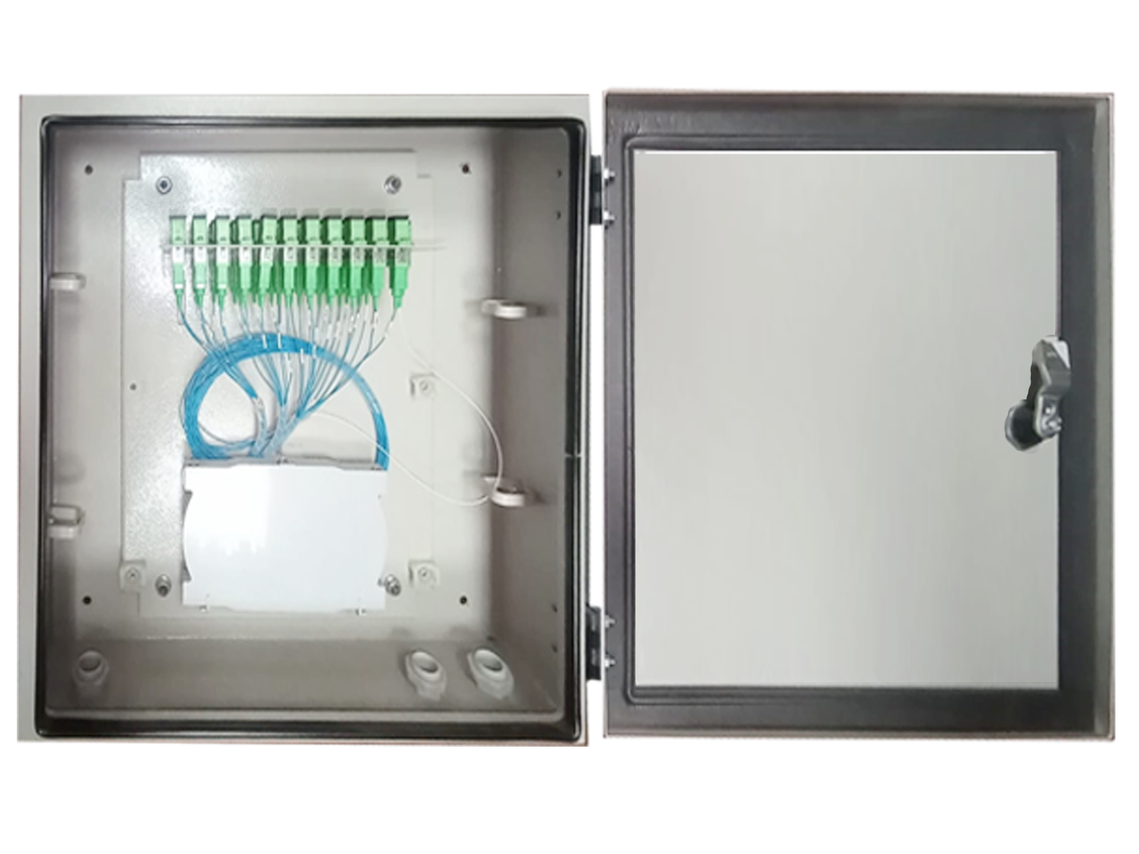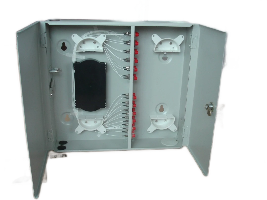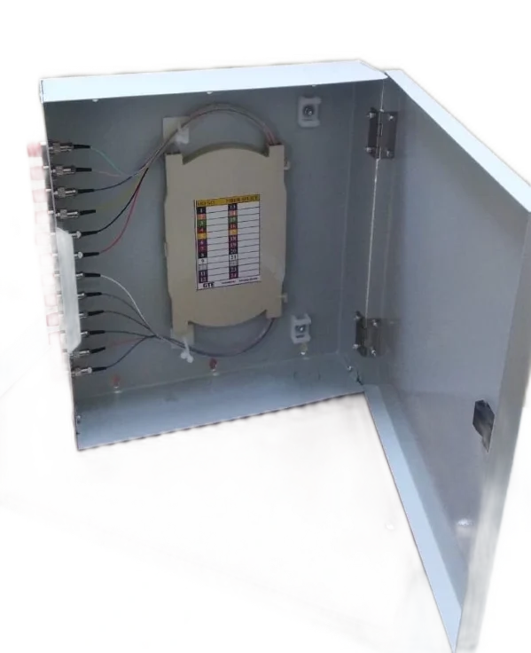 This fiber optic termination box is designed for wall mounted using, cold roll steel material, with adapter plate & splice tray, distribution &management